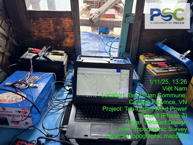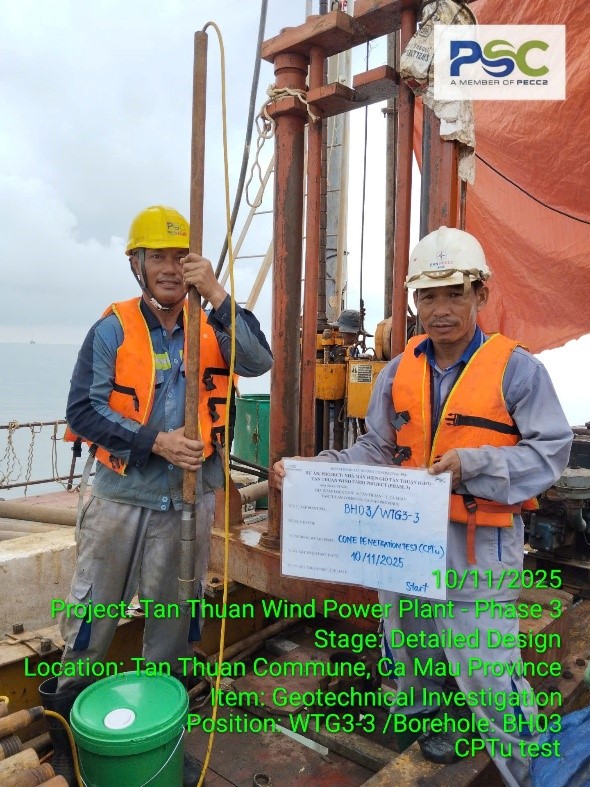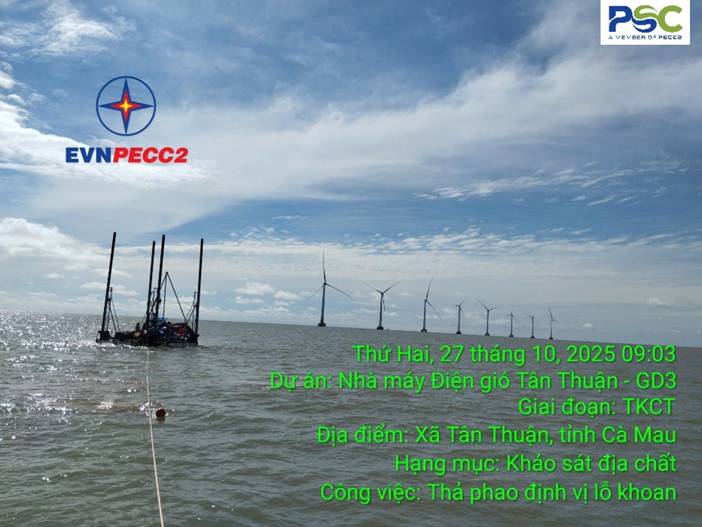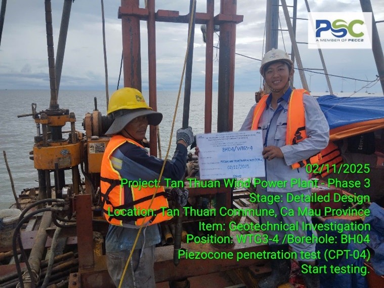 Cà Mau là tỉnh cực Nam của Tổ Quốc, là địa phương duy nhất cả nước có ba mặt giáp biển, tỉnh Cà Mau từng được xem là nơi dễ bị tổn thương bởi biến đổi khí hậu. Tuy nhiên, chính những yếu tố khắc nghiệt của tự nhiên như cái nắng chói chang và những cơn gió mạnh lại đang được vùng đất cực nam Tổ quốc biến thành một lợi thế khổng lồ để phát triển năng lượng tái tạo như điện gió, điện mặt Trời,………...Những cánh quạt của các dự án điện gió trở thành một biểu tượng mới cho sự phát triển của vùng đất Cà Mau, trong đó có Nhà máy điện gió Tân Thuận với công suất 100MW. Dự án Nhà máy điện gió Tân Thuận giai đoạn 1 và 2 được Xí Nghiệp Khảo Sát Tổng Hợp Miền Nam nay là Công ty TNHH Khảo sát và Xây dựng PECC2 (PSC) khảo sát năm 2020 và hôm nay cuối tháng 10/2025, chúng tôi những người khảo sát của Công ty TNHH Khảo sát và Xây dựng PECC2 được sự tin tưởng của Chủ đầu tư là Công ty CP Đầu tư Năng lượng Tái tạo Cà Mau (CMC) giao nhiệm vụ khảo sát Dự án giai đoạn 3.